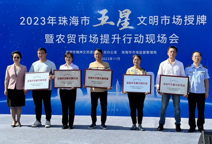2023年11月1日上午,市文明办、市市场监管局在星园市场广场召开2023年珠海市五星文明市场授牌暨农贸市场提升行动现场会。市场集团下属星园市场、柠溪市场被评为珠海市五星文明市场。本次全市共有82家农贸市场参与考评,只有得分95(含)以上的5家农贸市场能获评五星文明市场,市场集团占其中2席。市场监管部门,市、区文明办领导以及各农贸市场负责人共140人参加会议。市场集团董事长郑灿鹏、总经理刘新峰参加会议。