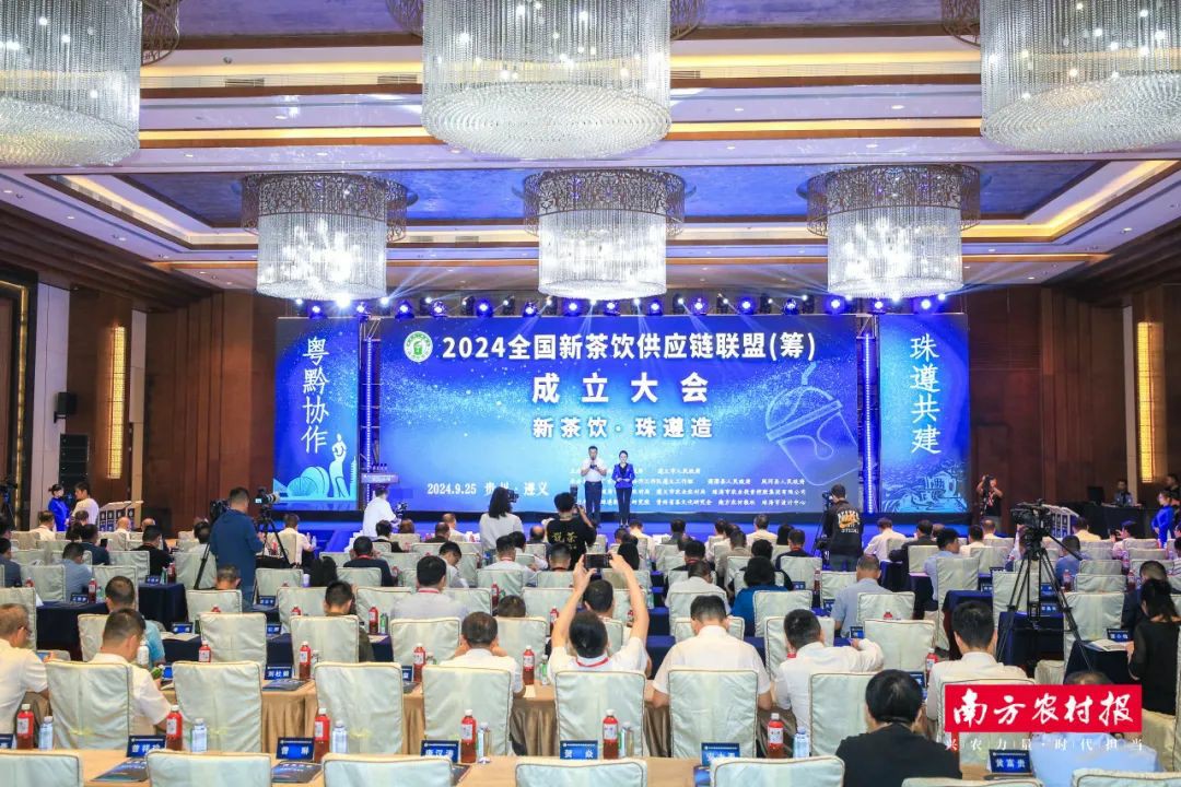 拓展茶饮新赛道,深挖消费新潜力,打造协作新标杆。9月25日,2024全国新茶饮供应链联盟(筹)成立大会在遵义市湄潭县举行。会上,珠遵新茶饮研究院暨战略咨询专家委员会、全国新茶饮供应链联盟(筹)揭牌,标志着珠遵两地共同打造的新茶饮供应链产业新生态迈出关键步伐,助力全国新茶饮供应链提质升级和新茶饮产业高质量发展。中国工程院院士、湖南师范大学校长、湖南农业大学学术委员会主任刘仲华,贵州省人大常委会原副主任、贵州省茶文化研究会会长傅传耀,贵州省农业农村厅二级巡视员杨绍武,珠海市副市长黄振球,遵义市副市长吴起,湖南农业大学副校长谢方平,遵义市湄潭县委书记、县人民政府县长游海燕,乐动(中国)集团党委书记、董事长李鸿斌出席活动。